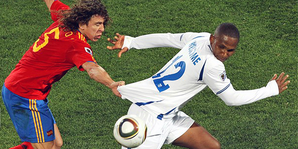 Honduras' Georgie Welcome has his shirt pulled by Carles Puyol of Spain during their World Cup finals match on June 21, 2010, in Johannesburg, South Africa. (Photo: FIFA via Getty Images)