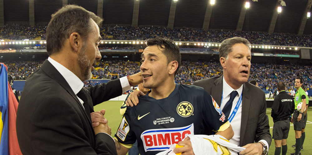 Club America head coach Gustavo Matosas (left) congratulates Rubens Sambueza after the second leg of the Scotiabank CONCACAF Champions League final on April 29, 2015, in Montreal. (Photo: Mexsport)