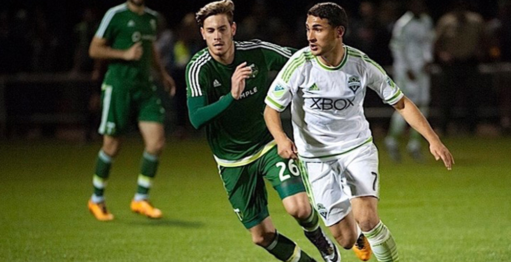Action the preseason friendly between the Seattle Sounders (white jersey) and the Portland Timbers on February 6, 2016, in Tucson, Arizona. (Photo courtesy of the Seattle Sounders)