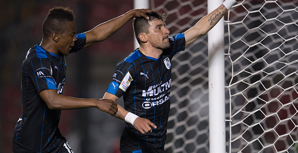 Queretaro's Edgar Benitez (right) celebrates after scoring against visiting D.C. United in a Scotiabank CONCACAF Champions League quarterfinal on February 23, 2016, in Queretaro, Mexico. (Photo: Mexsport)