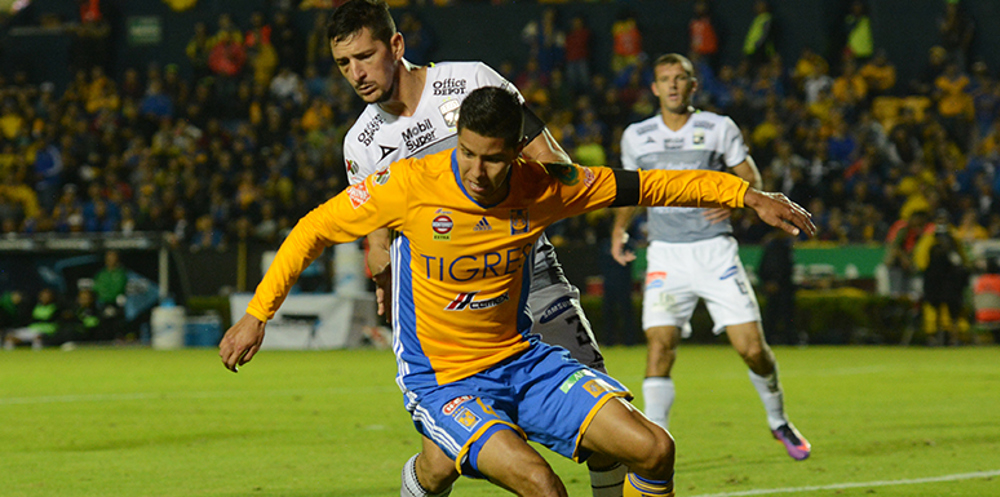 Action from Tigres last outing in the Liga MX Apertura playoffs, as Hugo Ayala (front) is pressured by a Leon defender on December 3, 2016, in San Nicolas de los Garza. (Photo: Tomas Palacios/Straffon Images)