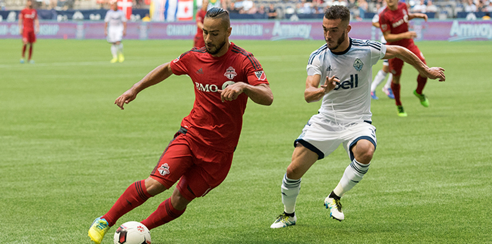 Acción del partido de vuelta de la final del Campeonato Canadiense Amway, entre el anfitrión Vancouver Whitecaps (camiseta blanca) y Toronto FC el 29 de junio 2016. (Foto cortesía Canada Soccer)