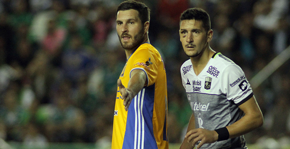 Andre-Pierre Gignac (izquierda) anotó el único gol en la victoria de Tigres sobre León en el partido de ida de las semifinales la Liga MX el 30 de noviembre 2016. (Foto: Manuel Montoya / Straffon Images)