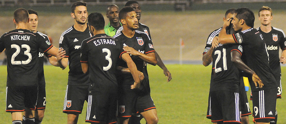 (ARRIBA) jugadores de DC United celebran tras derrotar a Waterhouse en la Liga de Campeones CONCACAF el 16 de septiembre de 2014, en Kingston, Jamaica.