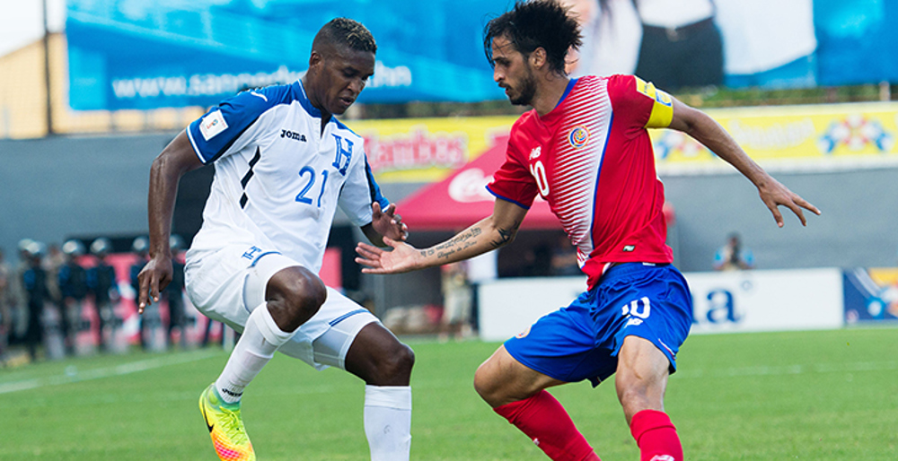 El hondureño Brayan Beckles (#21) enfrentando al costarricense Bryan Ruiz ha aparecido en 19 partidos por las eliminatorias para la Copa Mundial de la FIFA. (Foto: Mexsport)