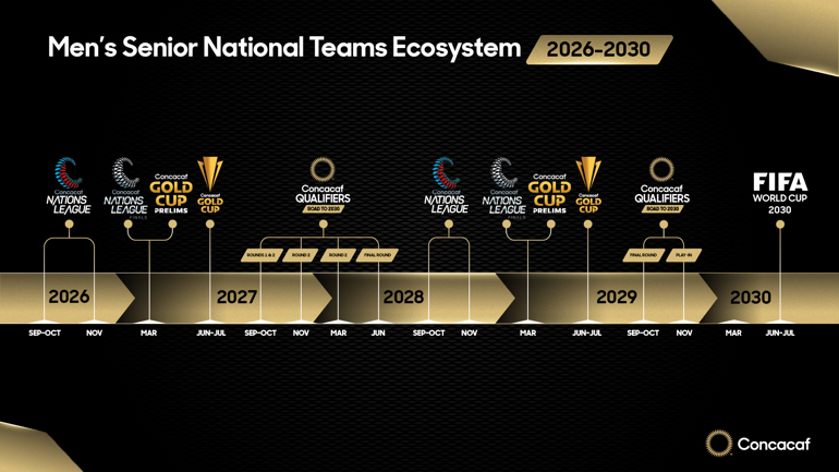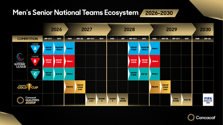 Miami, FL – Concacaf ha anunciado el calendario para las competiciones de selecciones nacionales masculinas de la Confederación que se disputarán del 2026 al 2030. El ciclo de cuatro años entre Copas Mundiales contará con múltiples ediciones de la Liga de Naciones Concacaf y la Copa Oro Concacaf, además de un formato renovado para las clasificatorias para la Copa Mundial de la FIFA.