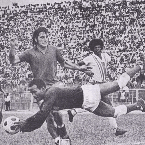 Emile Barron guardameta del Transval de Surinam controla el balón ante la presión de José Emilio Mitrovich en la final de la Copa de Campeones de Concacaf el 27 de octubre, 1974 en el Estadio Mateo Flores en Ciudad Guatemala, Guatemala.