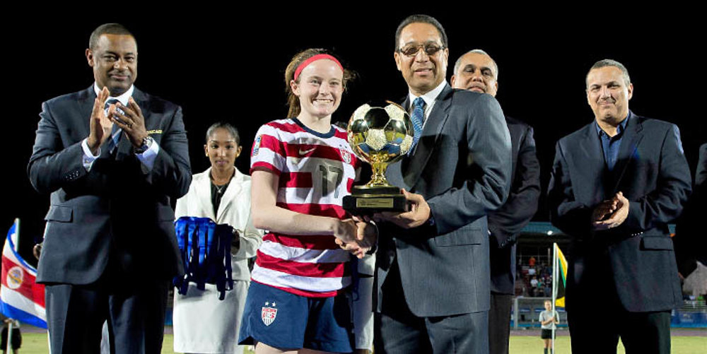 Rose Lavelle of the United States receives the 2014 CONCACAF Women's Under-20 Championship Golden Ball award from the Honourable Alden McLaughlin, Premier of the Cayman Islands, on January 19, 2014, at the Truman Bodden Sports Complex in George Town, Cayman Islands. (Photo: Mexsport)
