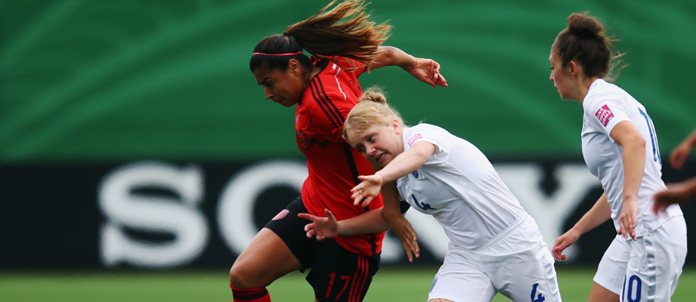 Mexico's Amanda Perez (left) is challenged by Sherry McCue of England during their FIFA U-20 Women's World Cup match at Moncton Stadium on August 9, 2014, in Moncton, Canada. (Photo: FIFA/FIFA via Getty Images)