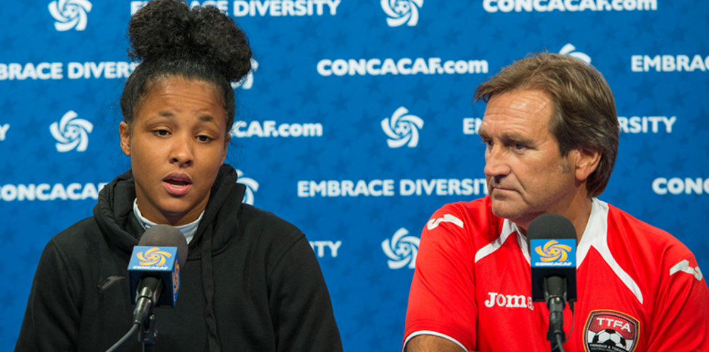 Trinidad & Trinidad team Maylee Attin Johnson (left) and head coach Randy Waldrum (right) speak at a CONCACAF Women's Championship press conference on October 23, 2014, in Chester, Pennsylvania, USA. (Photo: Mexsport)